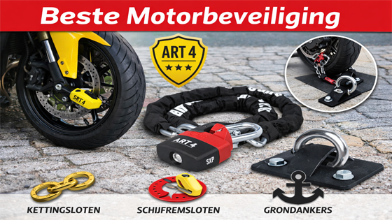 Motordiefstal gebeurt vaak snel. Zeker als een motor niet vast staat, kan hij eenvoudig worden opgetild en in een bus verdwijnen. De beste aanpak is daarom werken in lagen: een ART-kettingslot om de motor vast te zetten, een schijfremslot als extra drempel, en (thuis) een grondanker als vaste bevestigingsplek.