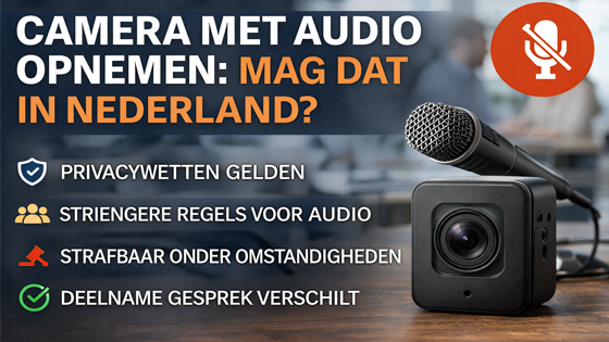 Een camera met audio opnemen mag in Nederland niet zomaar. Geluidsopname is juridisch gevoeliger dan alleen beeld. Voor particulieren, bedrijven en werkgevers gelden privacyregels, en in sommige situaties kunnen ook strafrechtelijke regels meespelen. Neemt u deel aan het gesprek, dan ligt dat vaak anders dan wanneer u gesprekken van anderen opneemt. Openbaar maken of delen van zulke opnames mag bovendien lang niet altijd.