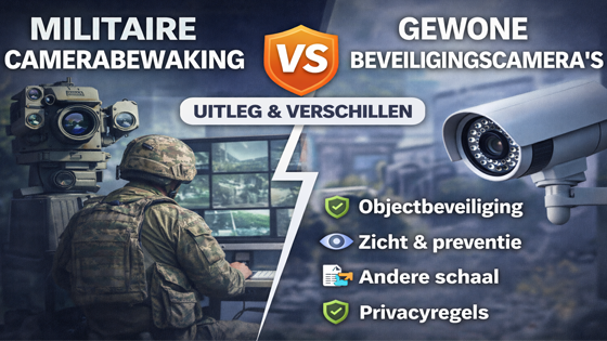 Mensen vergelijken deze twee vaak omdat ze allebei draaien om zicht, toezicht en beveiliging. Toch is het verschil groter dan het op het eerste gezicht lijkt. Een camera bij een woning of winkel is meestal bedoeld om eigendommen te beschermen of incidenten vast te leggen. Militair cameratoezicht wordt vaker gezien als onderdeel van zware objectbeveiliging en bewaking van locaties met een bijzonder belang.